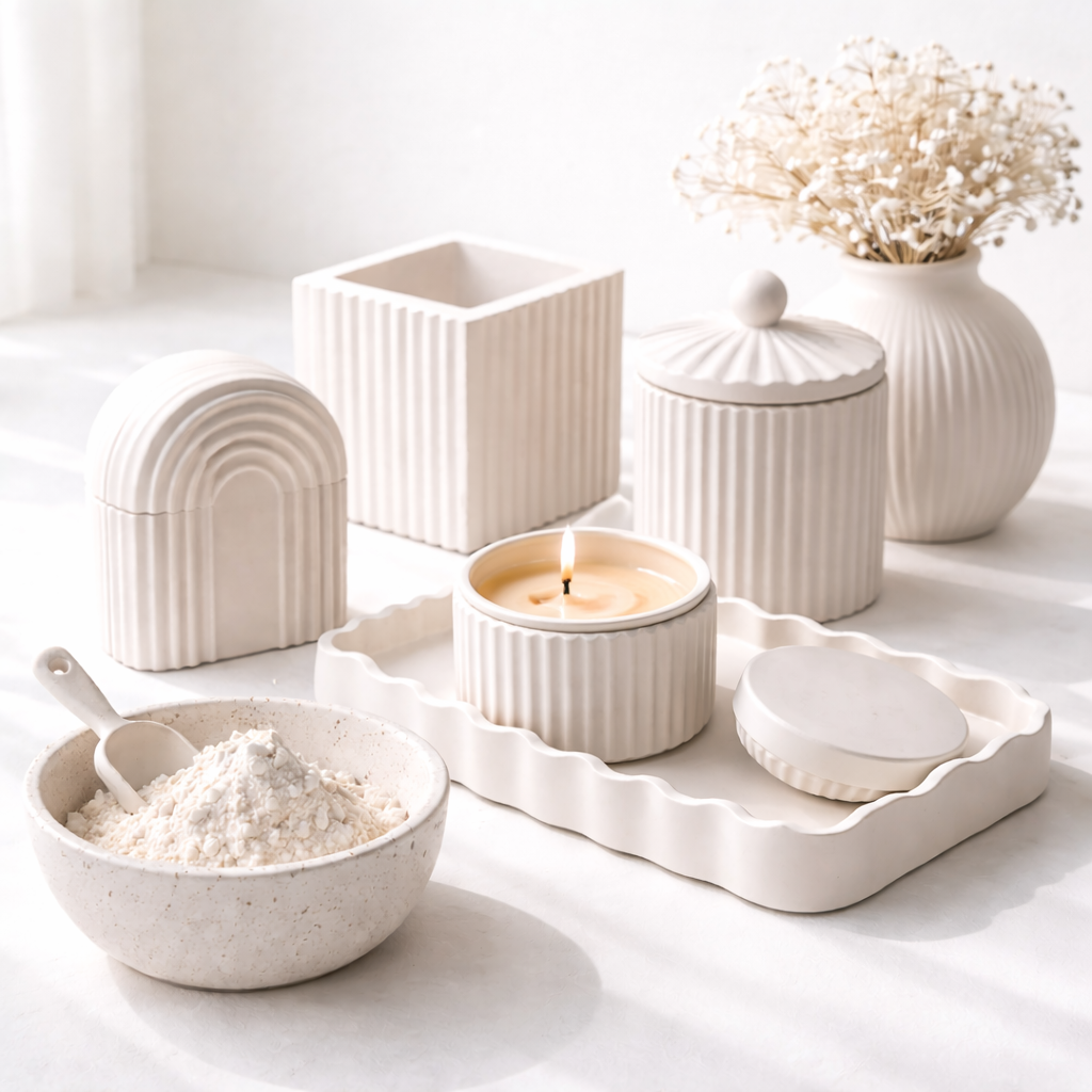 Polvo cerámico extra blanco para moldeo, ultra liso y sin burbujas. Ideal para crear objetos decorativos, velas y piezas DIY con un acabado profesional. Una alternativa más económica a la Jesmonite.