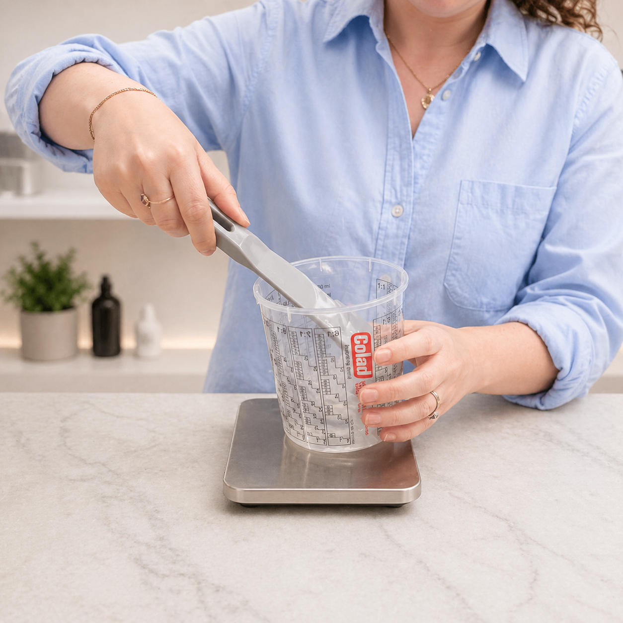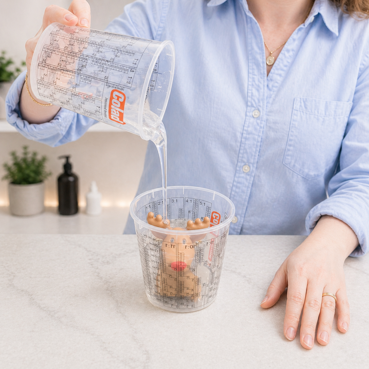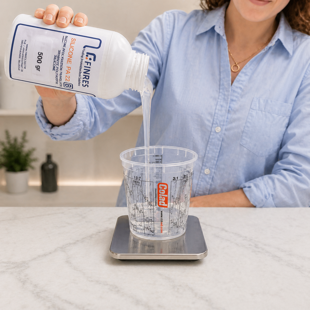 In a clean, dry container, weigh out the quantity of silicone required and calculate a 1:1 addition of catalyst (e.g.: 100gr base + 100gr catalyst).