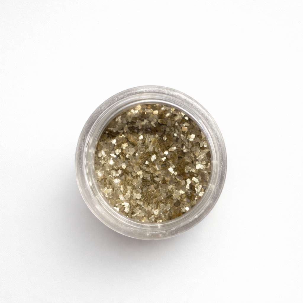Eco Glitters Large Gold est une paillette écologique dorée à granulométrie large, conçue pour offrir un effet visuel intense et profond tout en répondant aux exigences actuelles de réduction de l’impact environnemental